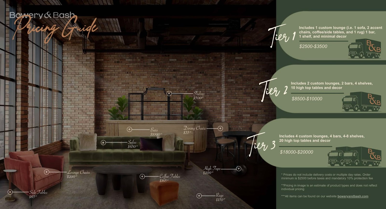 Bowery & Bash has a $2500 product minimum during non-peak season & a $3000 product minimum during peak season (May 1 – Nov 1) on Fridays, Saturdays & Sundays. This does not include applicable taxes, our protection plan and transportation costs.