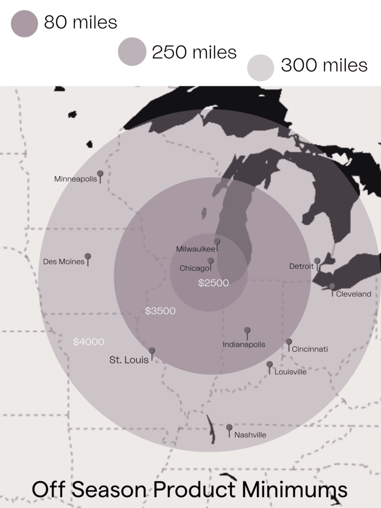 We will travel approximately up to 300 miles from our warehouse in Chicago to midwest cities including Milwaukee, Madison, Indianapolis, Detroit, Des Moines & St Louis. Please see the map below for how your rental minimums differ the further your event is.