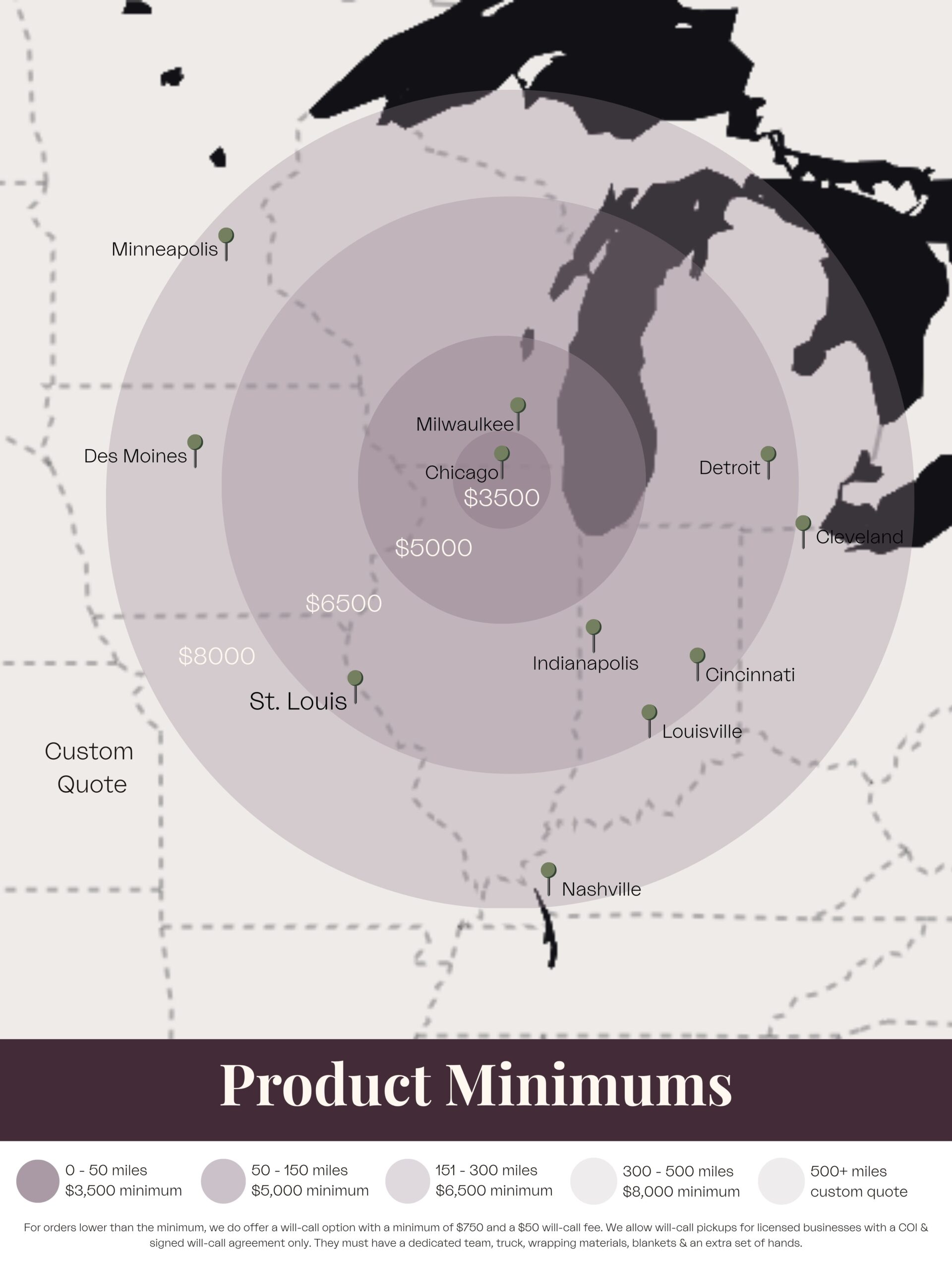 Bowery & Bash has a $3000 product minimum during non-peak season & a $3500 product minimum during peak season (April 1 – Nov 1). This does not include applicable taxes, our protection plan and transportation costs.