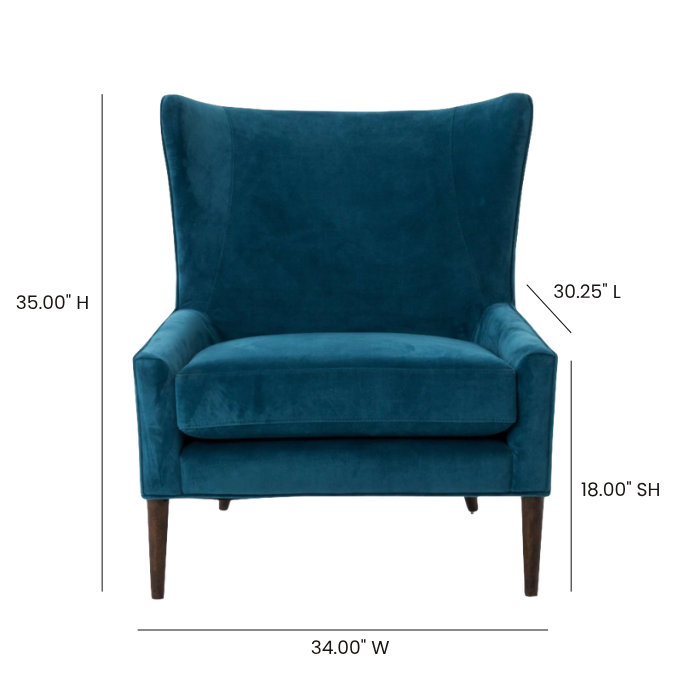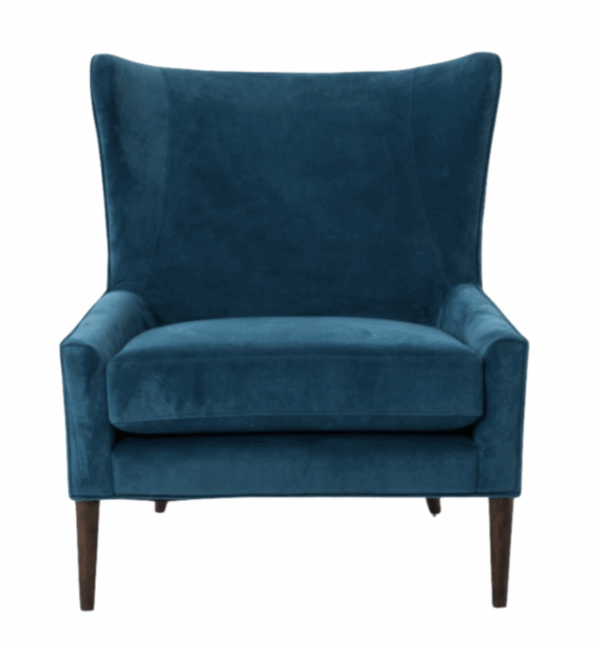 Traditional wing-style chair featuring teal velvet and tapered legs.
