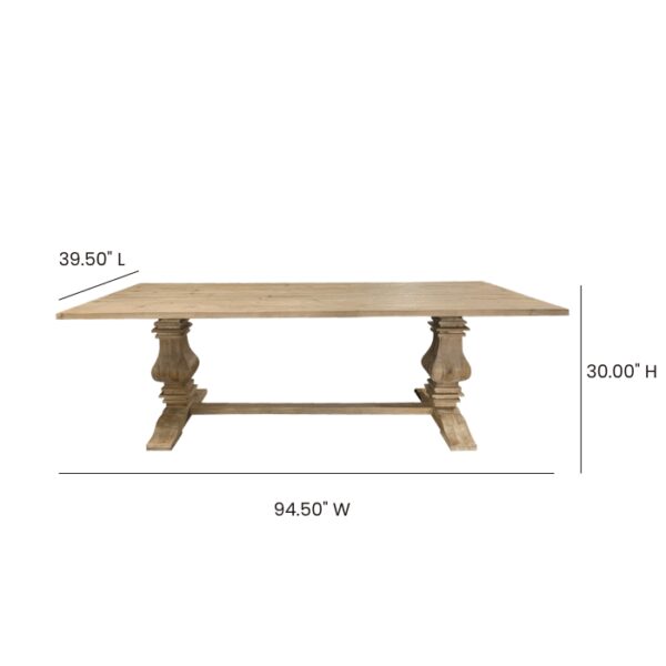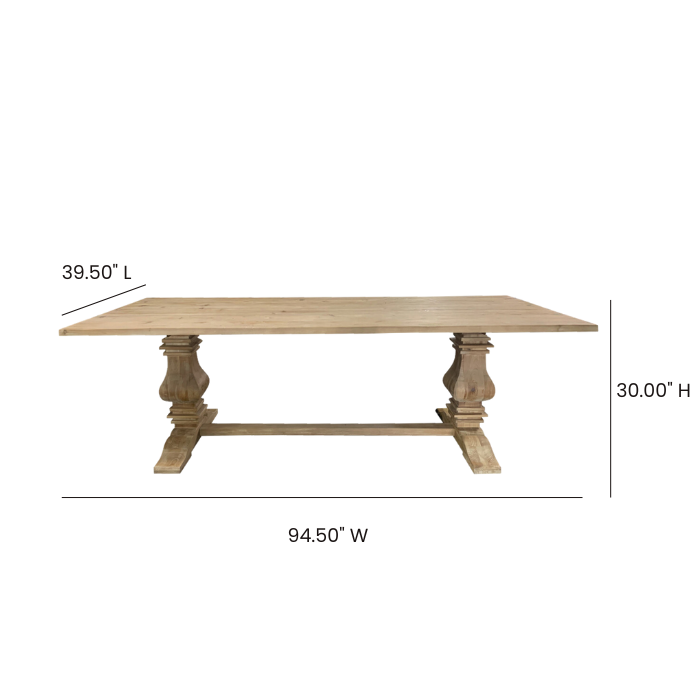 Antiqued wood farmhouse table, pedestal base, comfortably seats 8-10 people. 94.5 x 39.5 x 30