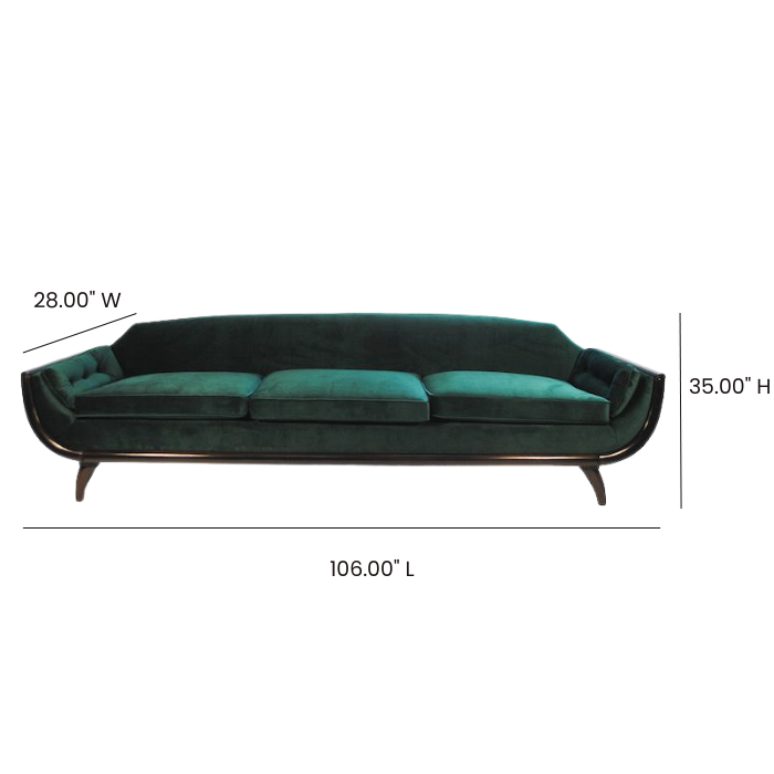 Mid-century sofa with emerald green velvet upholstery.