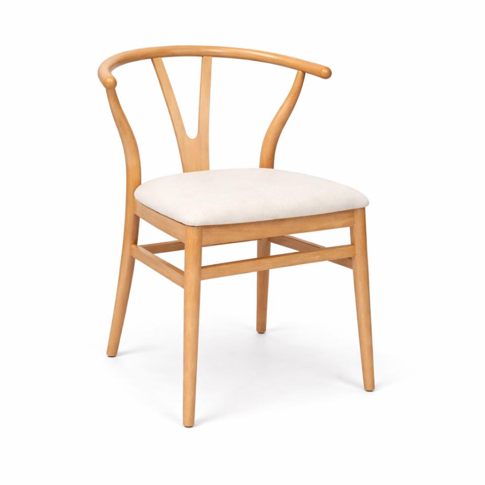 A timeless, Scandinavian-inspired dining chair crafted from warm solid wood with a gently curved backrest and a softly upholstered seat for effortless comfort and style.
