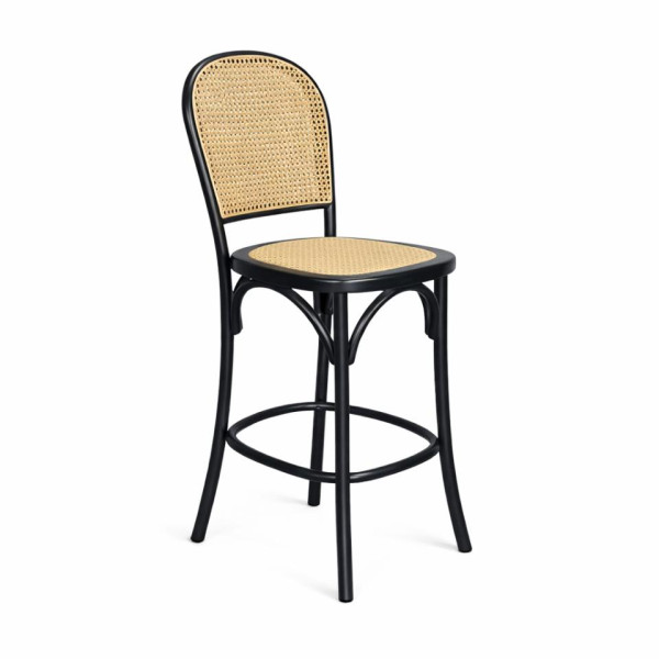 A classic bistro-inspired barstool featuring a sleek black bentwood frame, woven cane backrest, and matching cane seat.