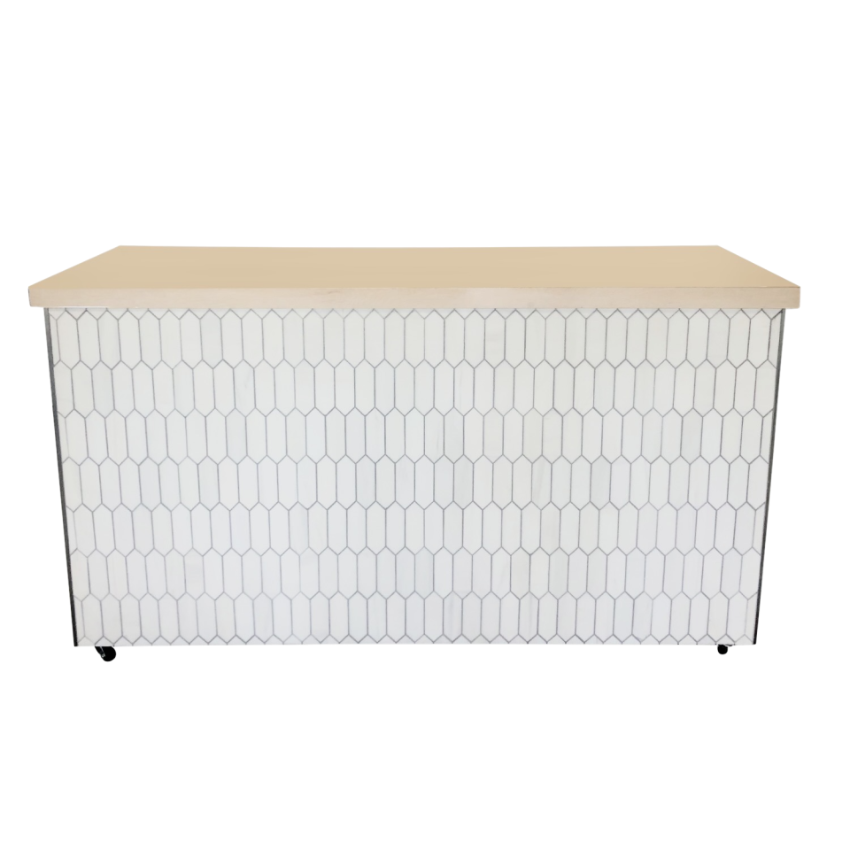 White carrera marble tile bar with bleached wood top. Item is on black casters and has built in shelving.