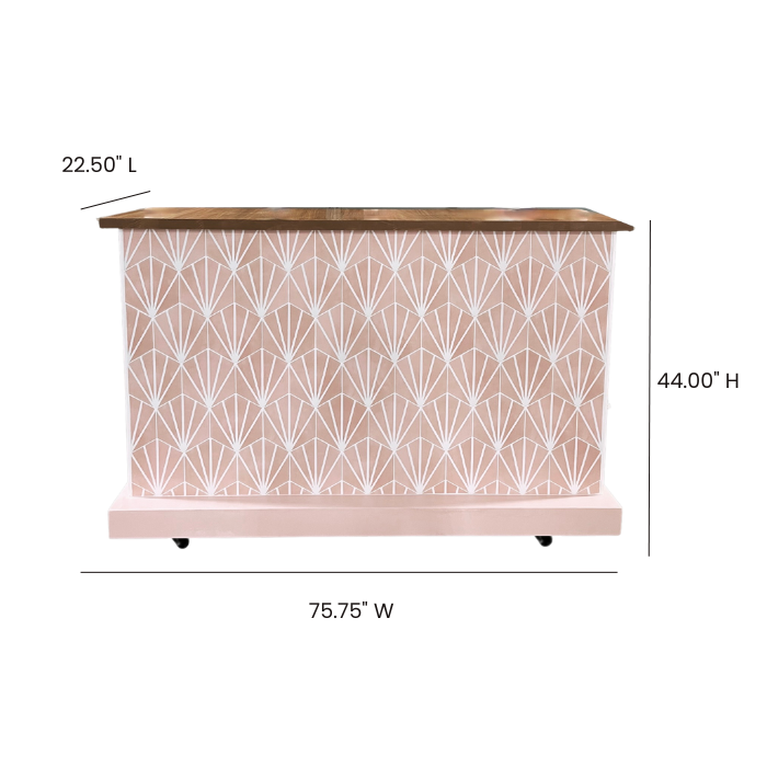 Dusty coral geometric tile bar, dark stained wood top.
