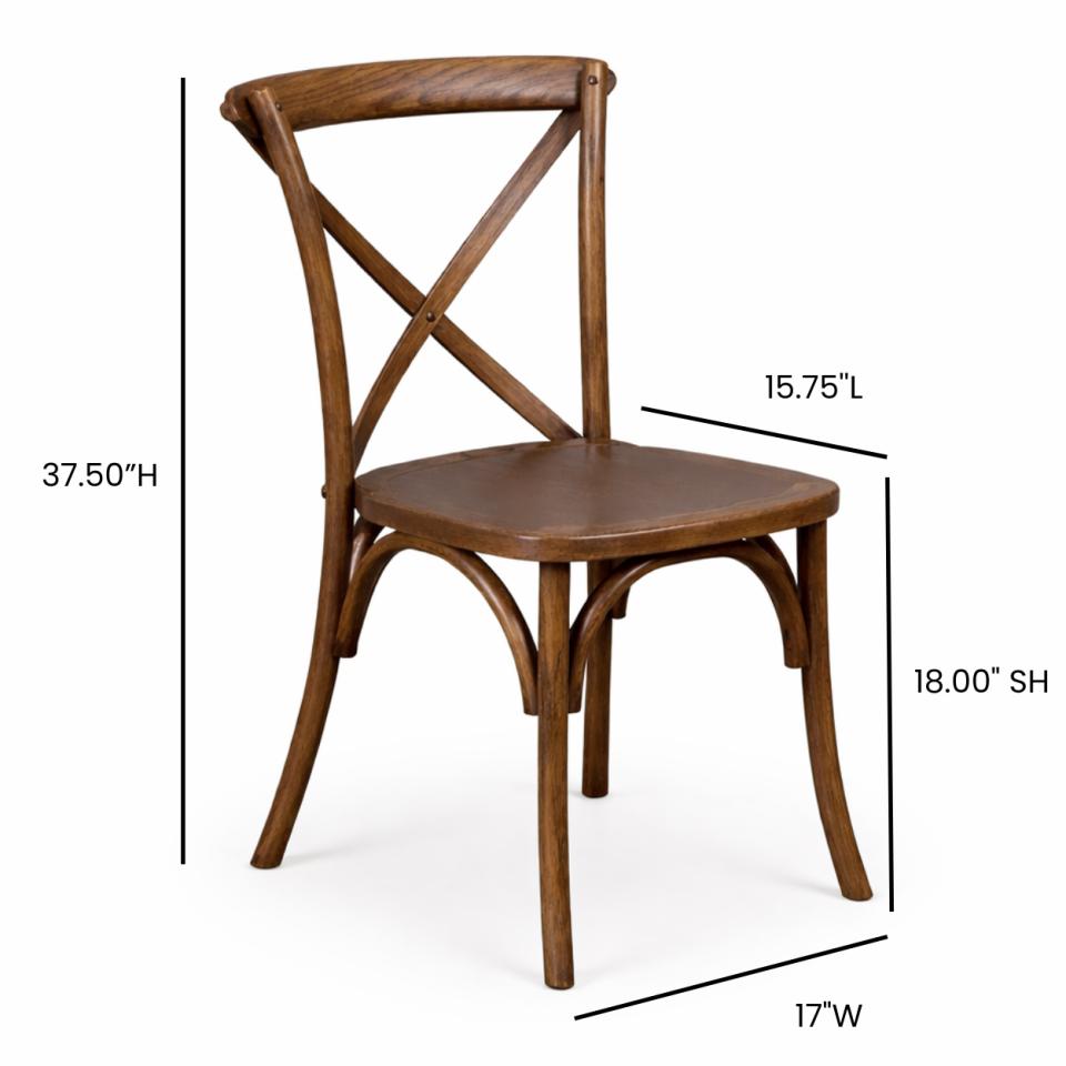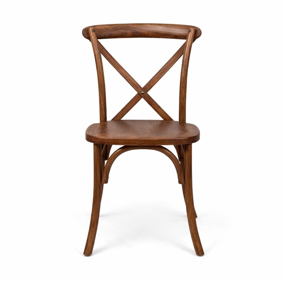 Warm walnut cross-back dining chair with a classic X-frame and smooth wood seat.