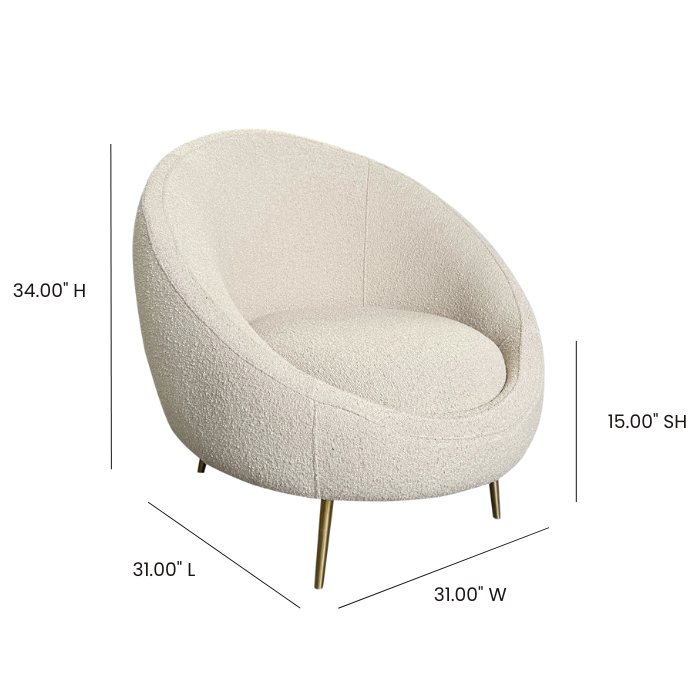 Round accent chair with sand colored boucle upholstery, pale gold legs.