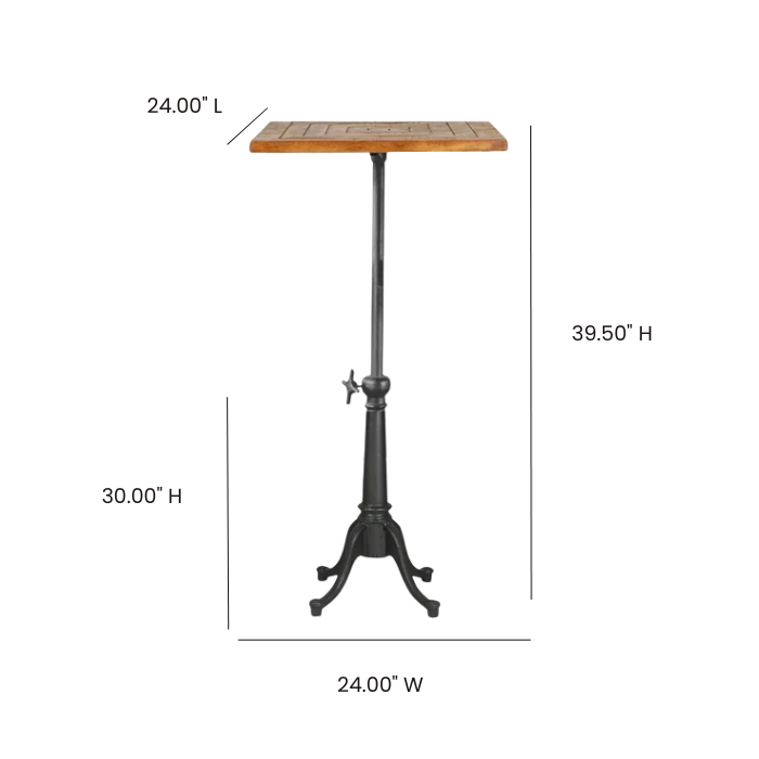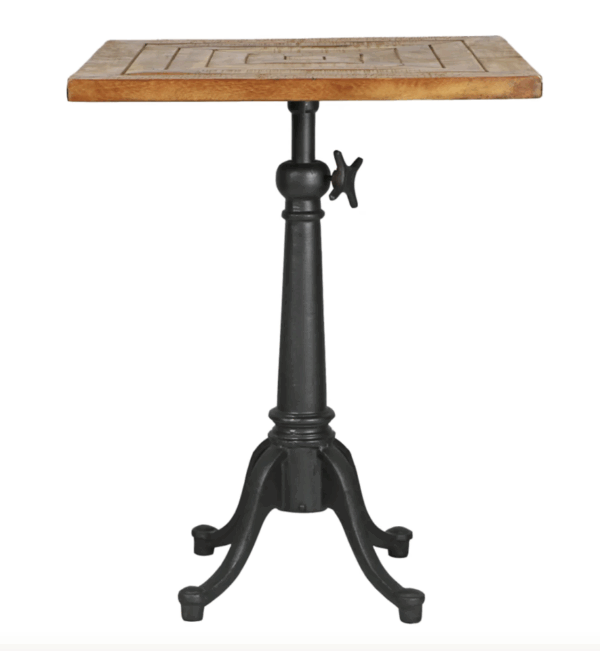 Adjustable French inspired cafe table with geometric mosaic top. Adjusts to hightop height, 39.5″ tall.