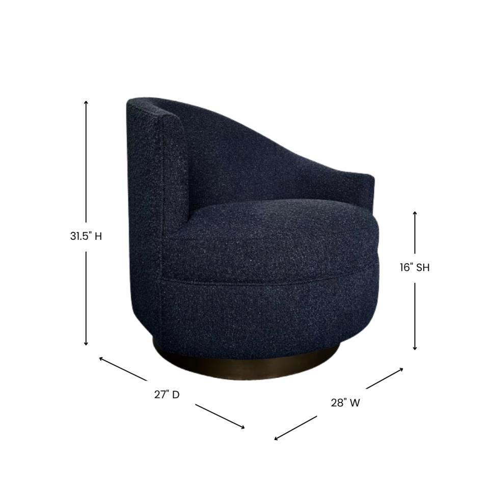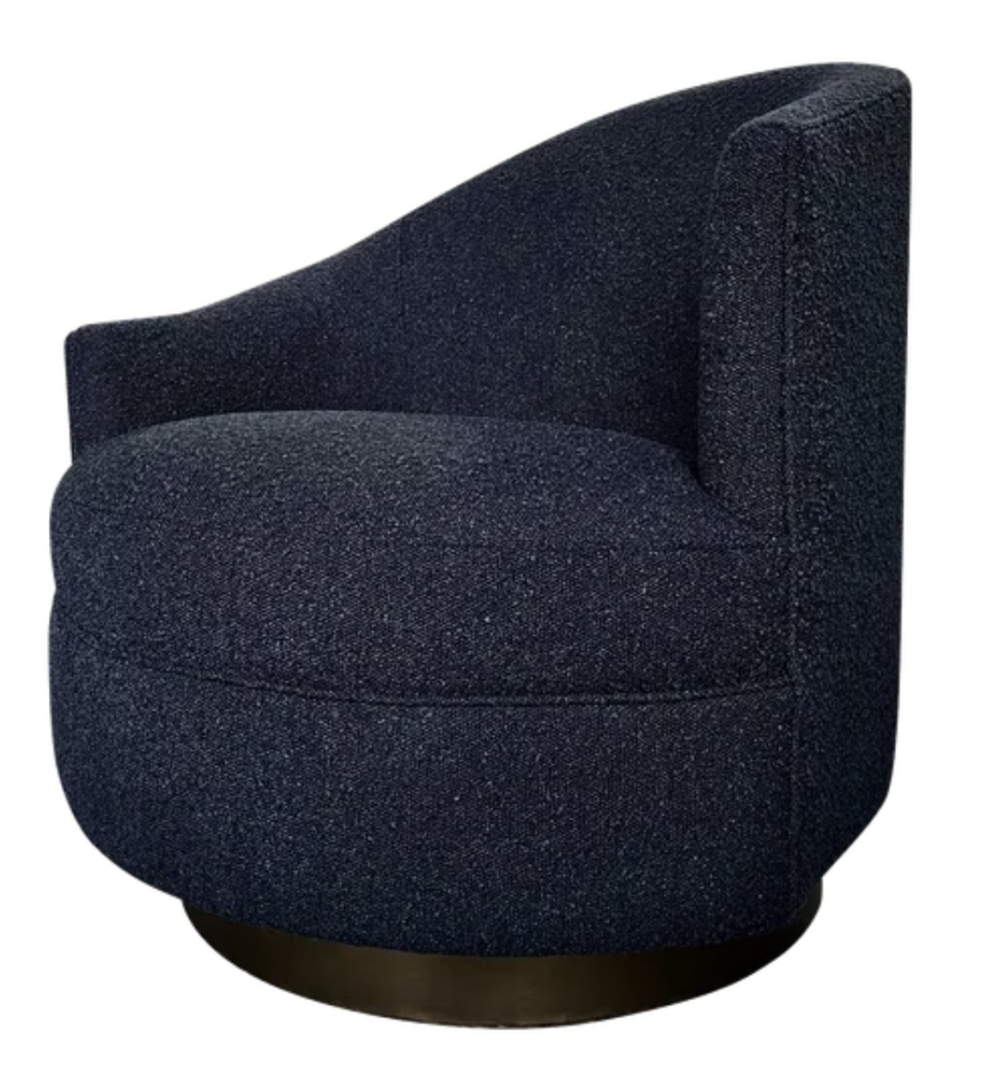 Dark boucle navy blue Kagan style asymmetrical chair with dark brass platform swivel base.