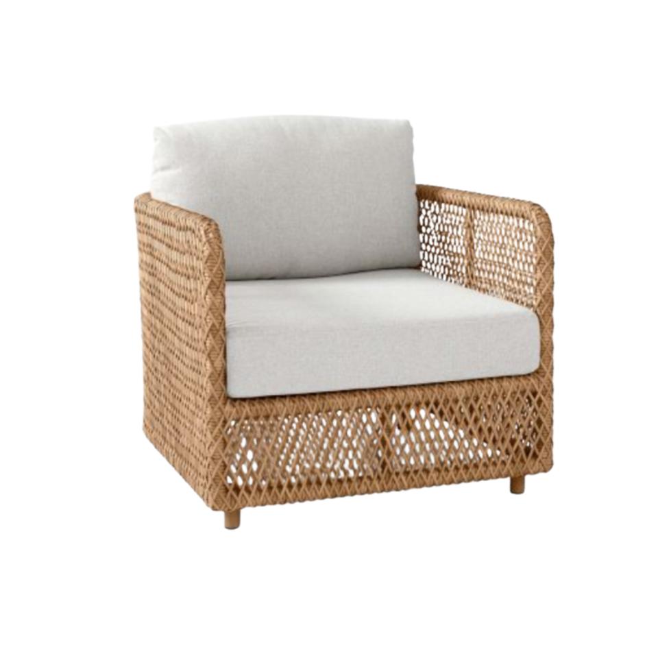 Coastal-inspired lounge chair features Natural all weather wicker paired with pale gray weather resistant cushions.