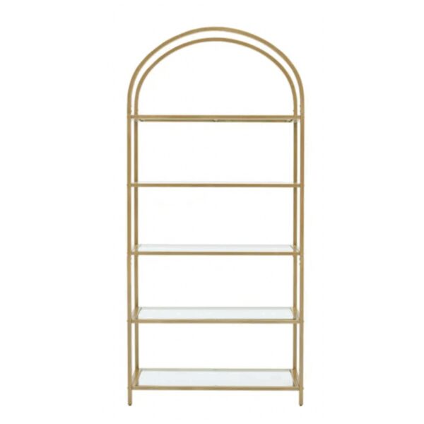 Arched, gold barback with glass shelving.
