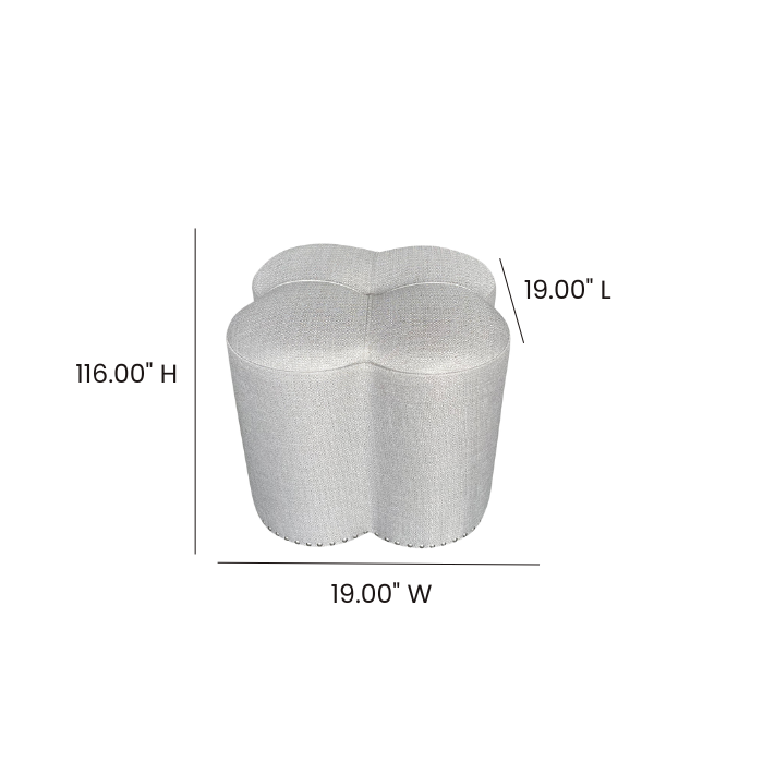 Grey woven linen-look clover-shaped ottoman with silver nailheads.
