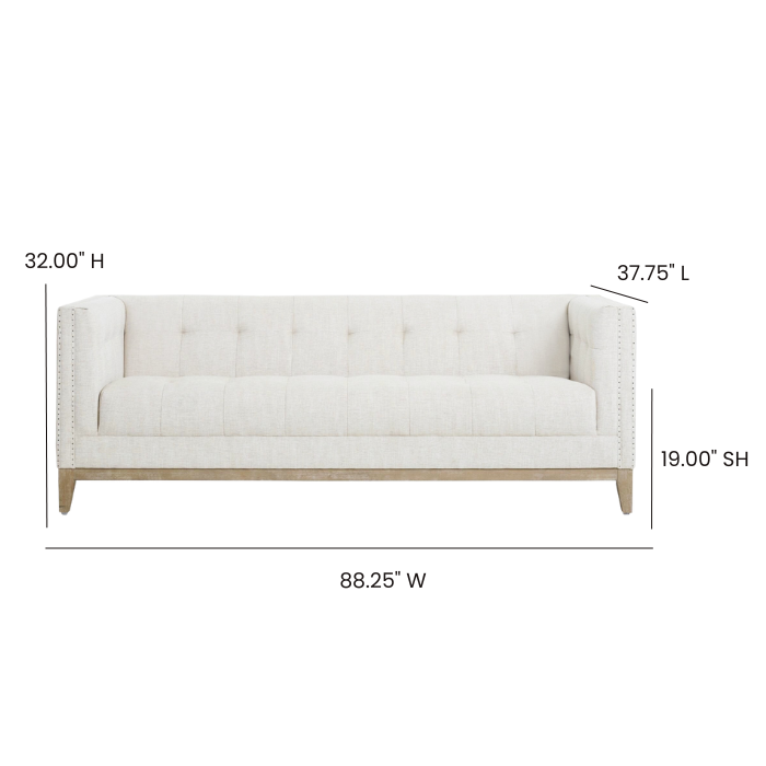 Ivory linen sofa featuring raw nail head detailing.