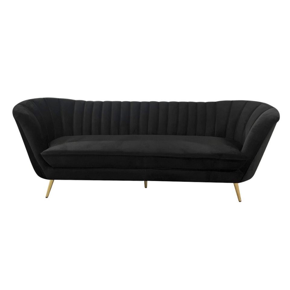 Black velvet and channel backed sofa with sleek gold steel legs.