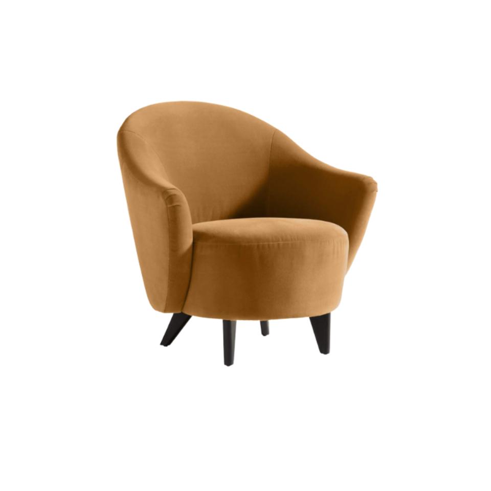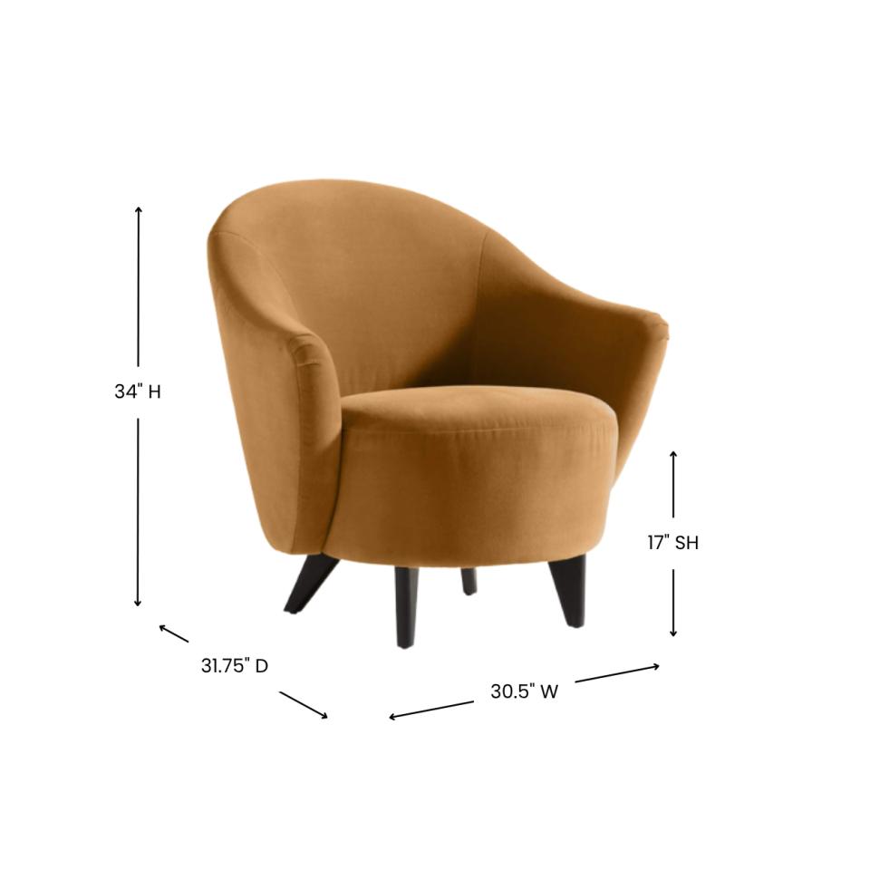 Velvet ochre-colored upholstery, curved back & rounded seat cushion.