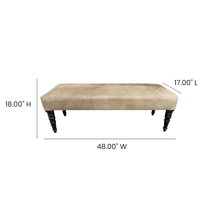 Contemporary bench with sand colored cowhide uphostery.