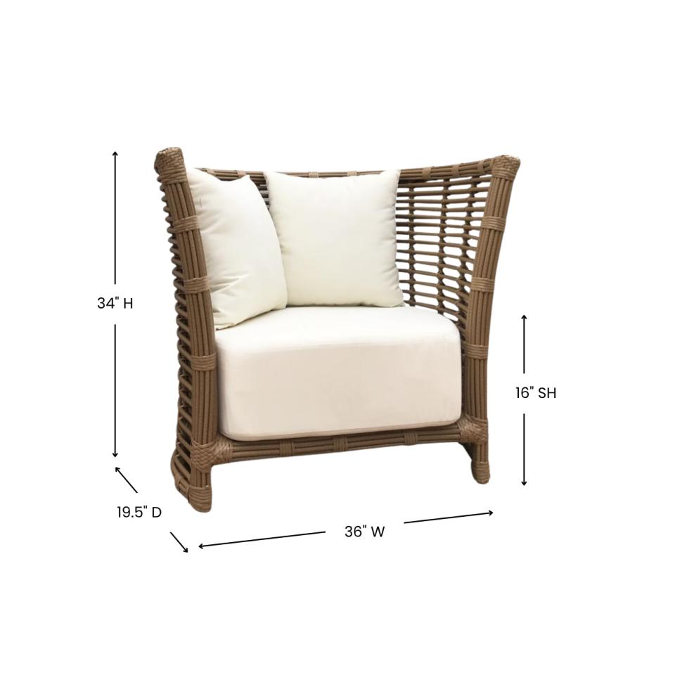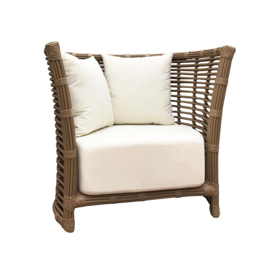 Outdoor chair with modern tiki vibe and ivory Sunbrella cushions.
