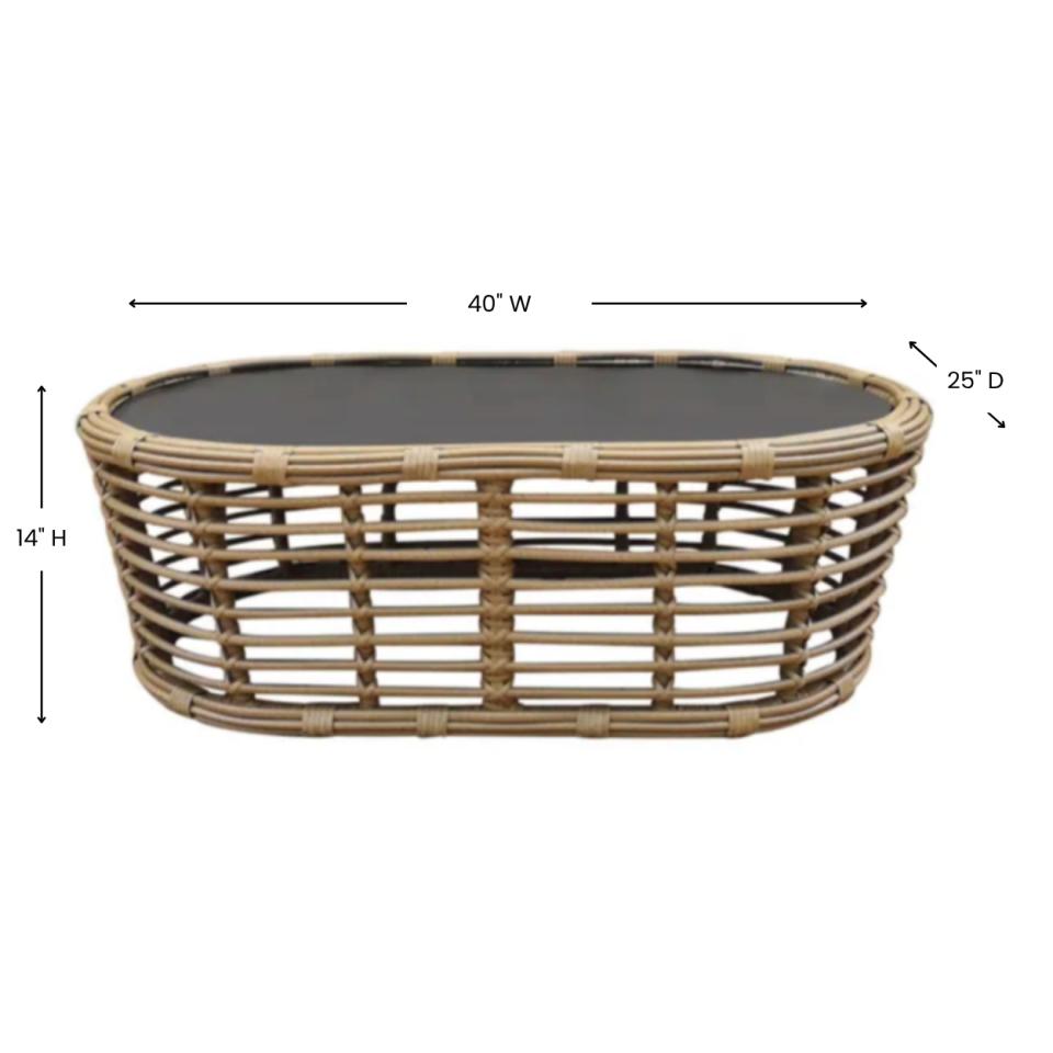 This chic oval rattan coffee table pairs an airy, hand-lashed open weave base with a moody dark glass top, making it the perfect statement piece for elevating any outdoor event or celebration.